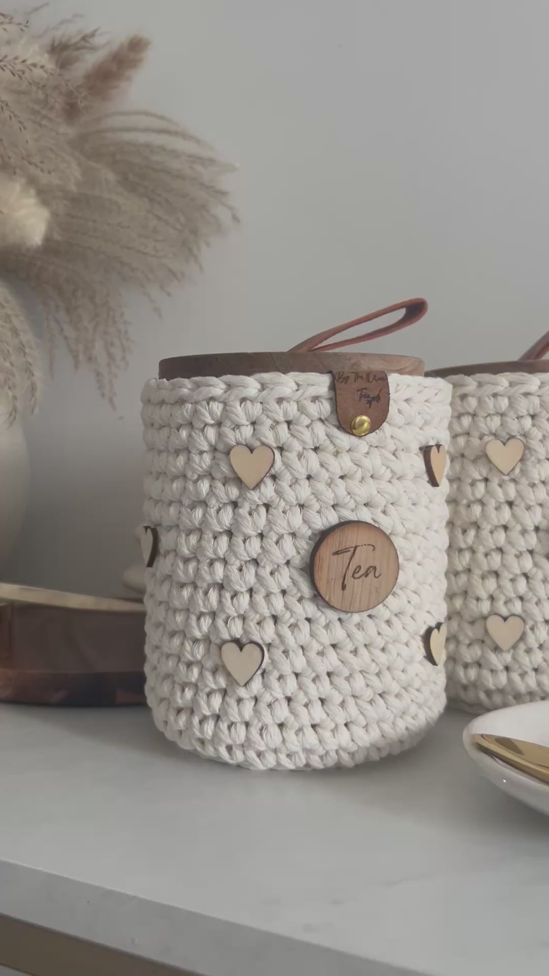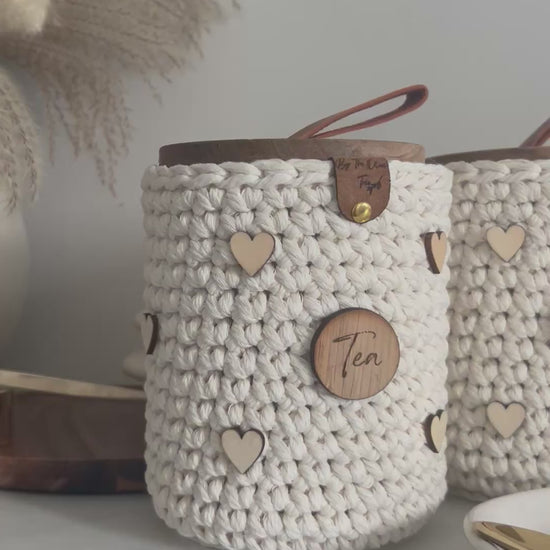 These Jars are made of Glass and hold 750ml, The lids are wooden with a faux leather pull and the sleeves are carefully crocheted with a rustic hard wearing sustainable chunky cotton for that Boho/Farmhouse aesthetic.
